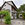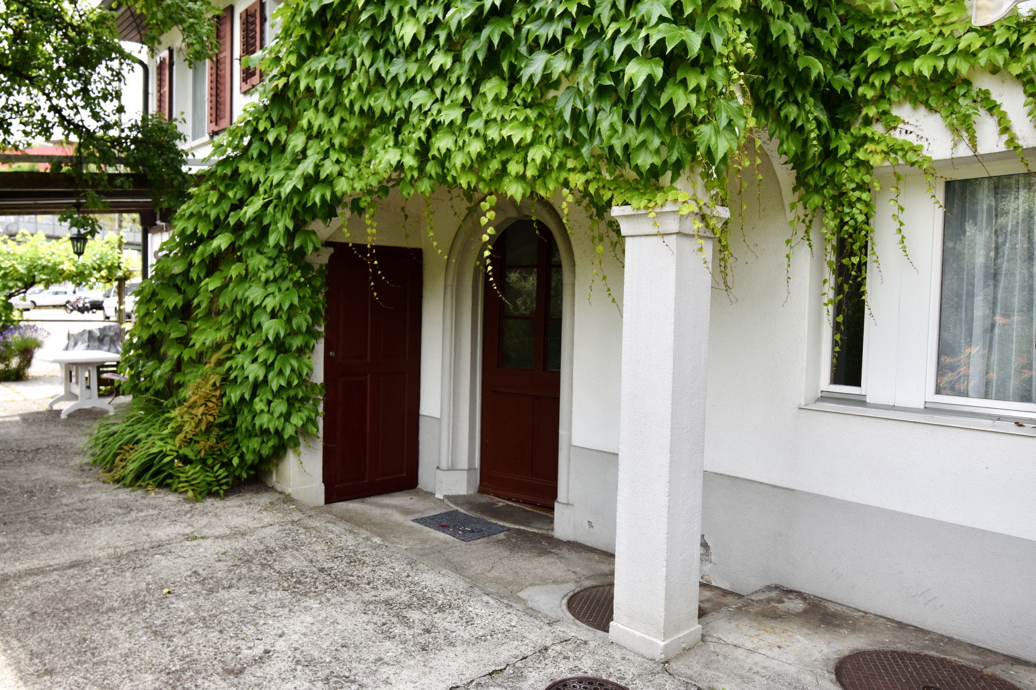 The entrance is located after the pergola seating area, past the stairs on the left-hand side.